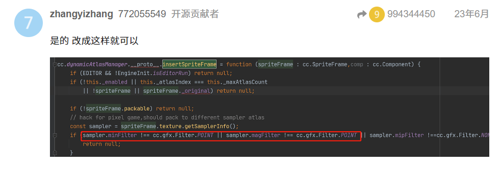 按照api文档的话图集的过滤模式不应该是由第一张spriteframe的过滤模式决定的吗?居然我所有的图片都是Nearest过滤模式,那么它应该直接给我生成一个Nearest过滤模式的图集才对啊?按照api文档的说法我应该不用改源码就能用动态合图了呀