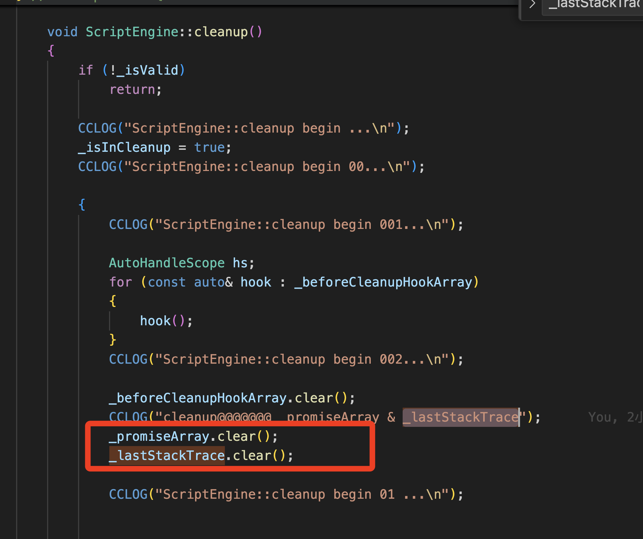 你在 ScriptEngine::cleanup 里面,清空一下 _promiseArray,应该就可以修复。这个应该是之前处理这块逻辑,没有考虑到这种极端条件(即,在 restart 前刚好有 pushPromiseExeception 一次)
