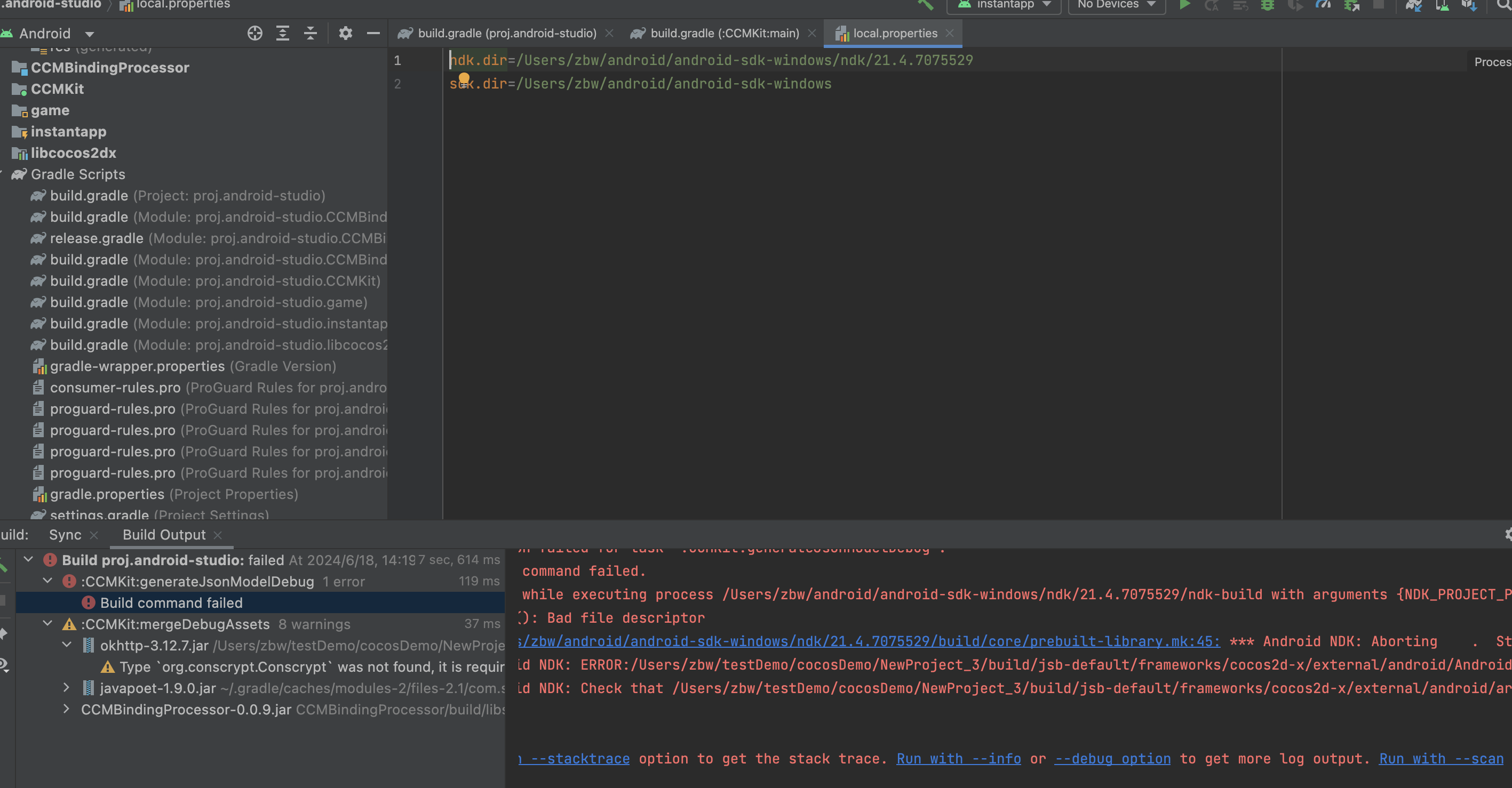 还是和以前的报错一样,我的操作流程是新建了个项目,然后把cocomat放进来,构建的时候选择arm64-v8a然后再as里编译就报错,勾选的时候去掉arm64-v8a就能打包。