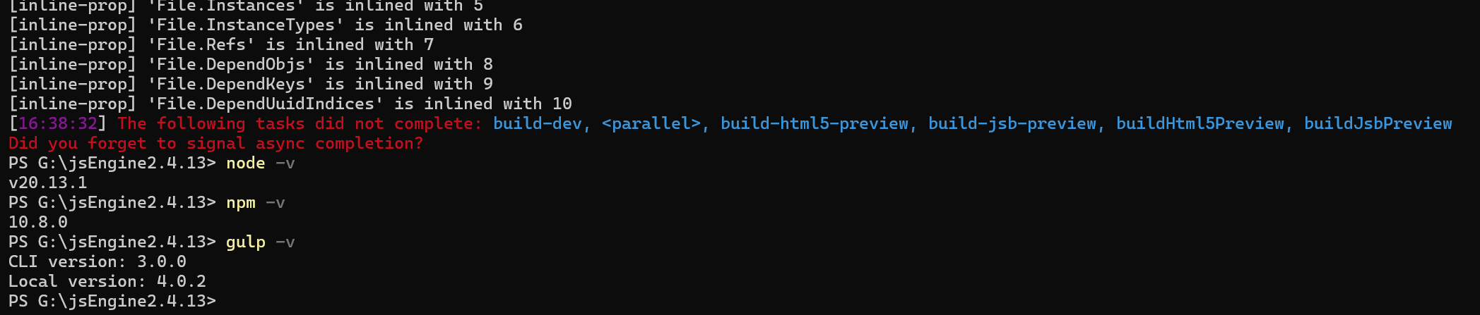 提示: The following tasks did not complete: build-dev, < parallel >, build-html5-preview, build-jsb-preview, buildHtml5Preview, buildJsbPreview