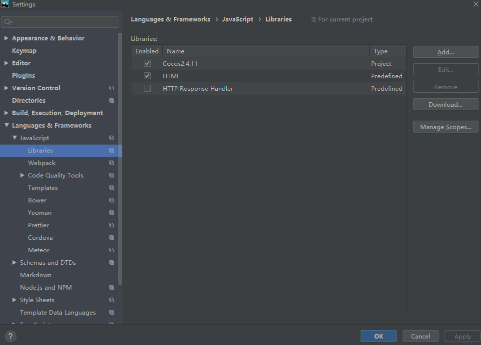 代码提示可以用 Libraries 引入 Creator 安装目录下的引擎代码,但主要是 shader 的语法,Cocos 的 shader 语法在 WebStorm 上找不到比较好的代码提示插件,不像 VSCode 上还有个官方的插件可以用。