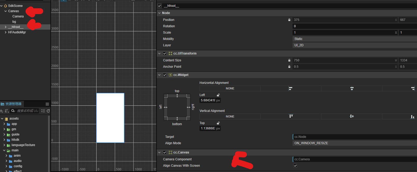 如图,除了新建场景默认带的Canvas,我们自己创建了一个__hfroot__的节点,也加了canvas组件。