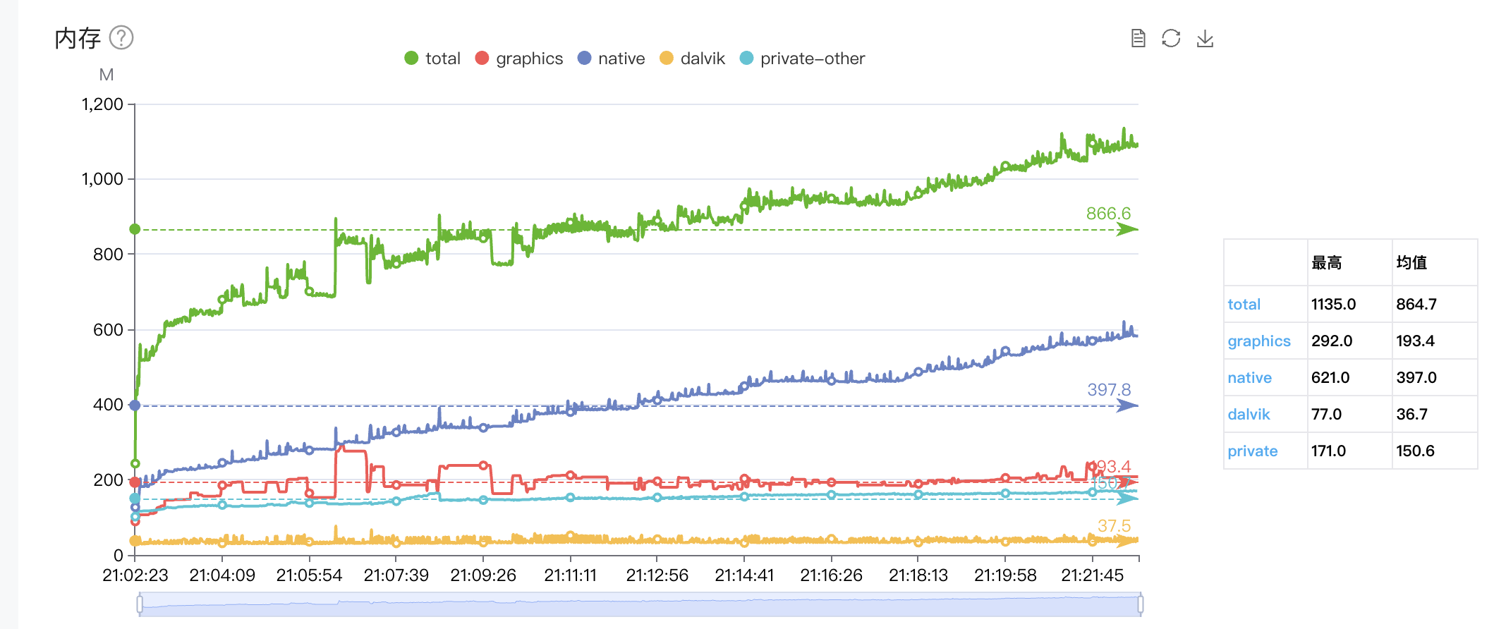 在微信云测试上发现大部分安卓设备的内存峰值都超过了建议值,但是所有iOS设备都正常;