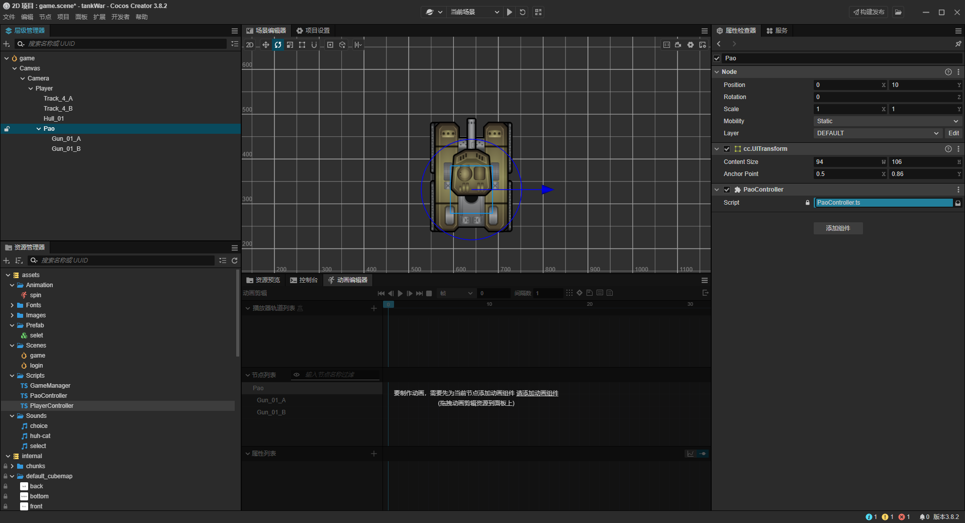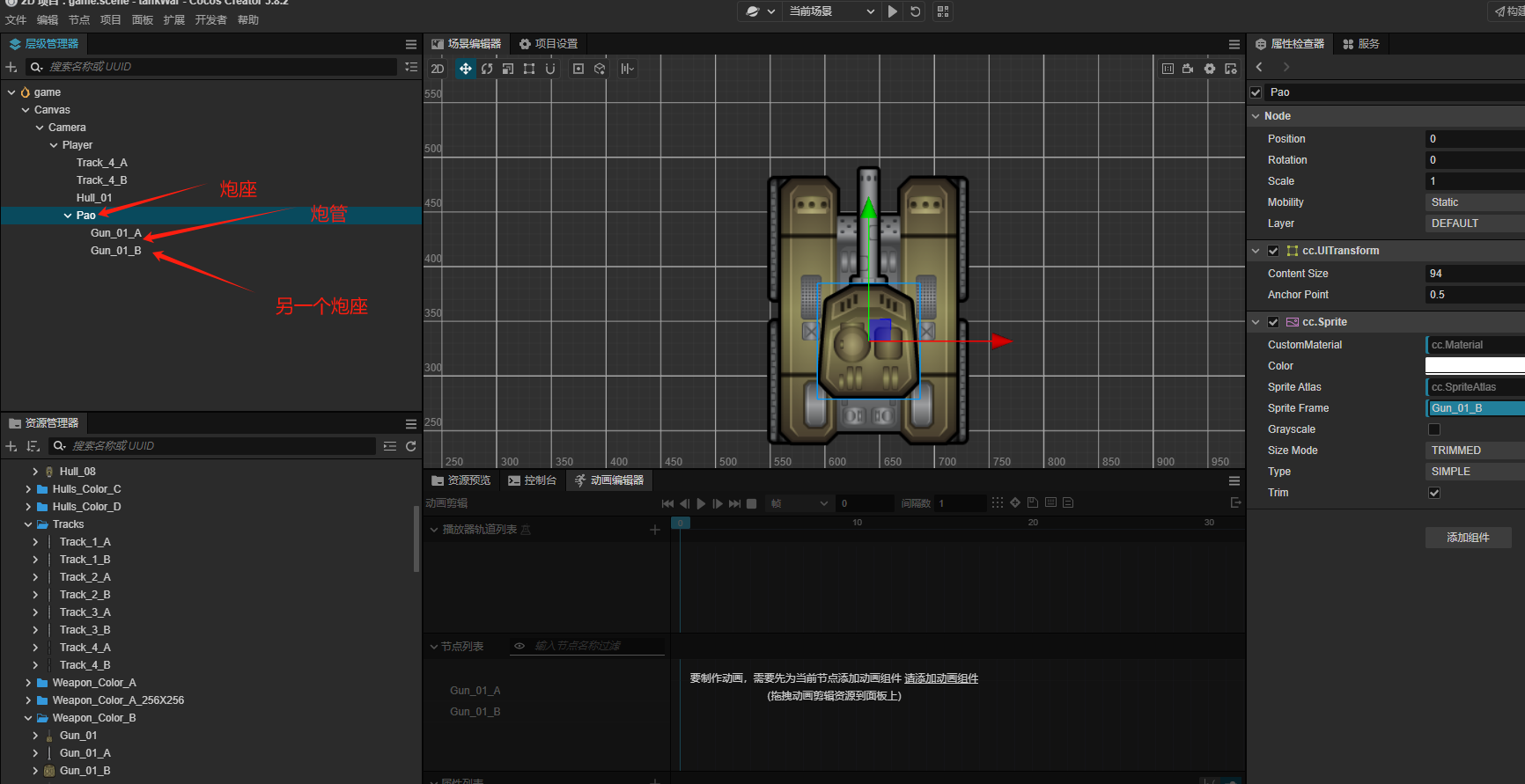 我之前就是这么做的,把炮塔和炮管都放到子节点里,但是这样的话锚点就不准了,因为我想以炮塔为中心旋转,但是父节点锚点默认是中心,我还得手动调那个Anchor Point,感觉还调不太准,不像把父节点作为精灵那样准确
