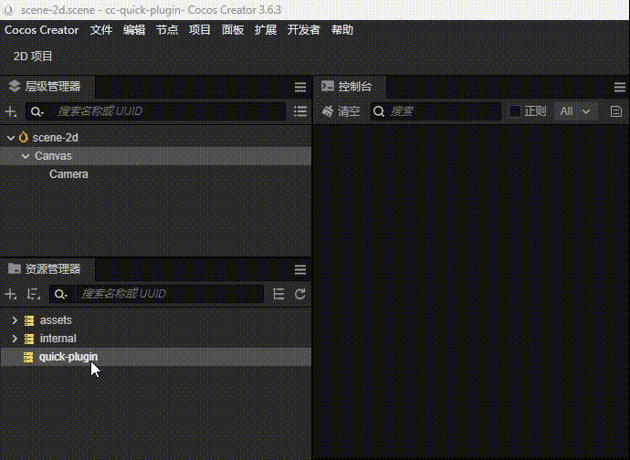 目前 QuickPugin 支持的功能有:主进程事件、场景脚本事件、vue面板(非vue文件)、inspector扩展(component 和 asset)、节点/资源/顶部菜单扩展