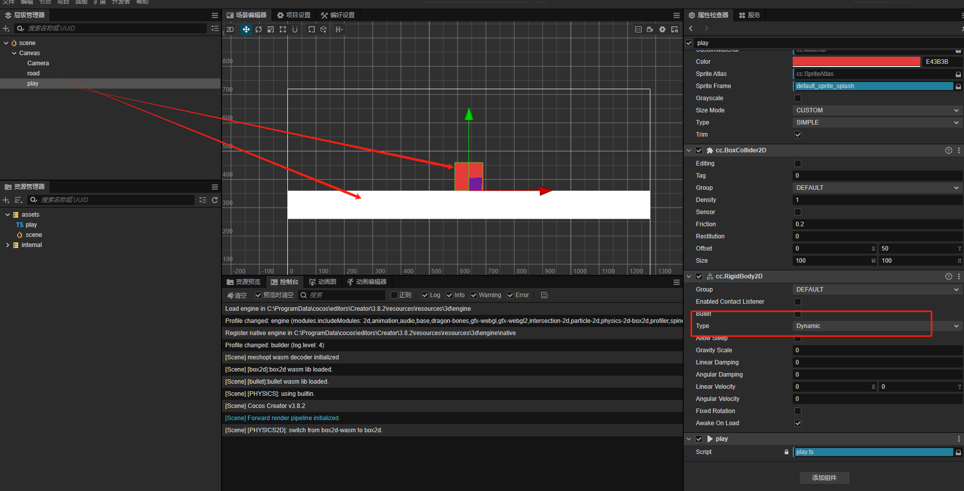 如图 road没有设置刚体 play是游戏角色 默认position的y是0 设置了刚体为Dynamic 重力已经设置成了0 在update中 设置position的y一直为0 但是第二帧开始就不是0了 y轴向下移动了一点 世界左边的y却没有发生这么大的变化 play 刚体设置成animated才不会出现这个问题 但是又不能满足我想让play被障碍物阻挡(虽然能用代码实现阻挡效果,但是我爱钻牛角尖,就是想找到Dynamic 这是什么问题导致的) 希望各位大佬能指明一下问题所在 跪谢