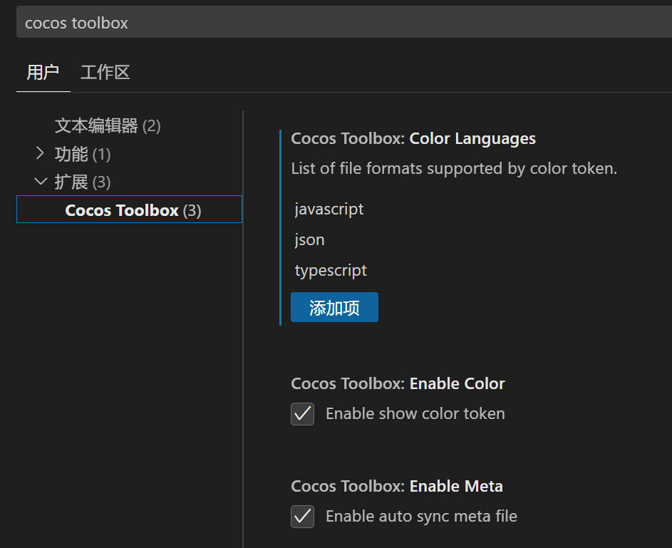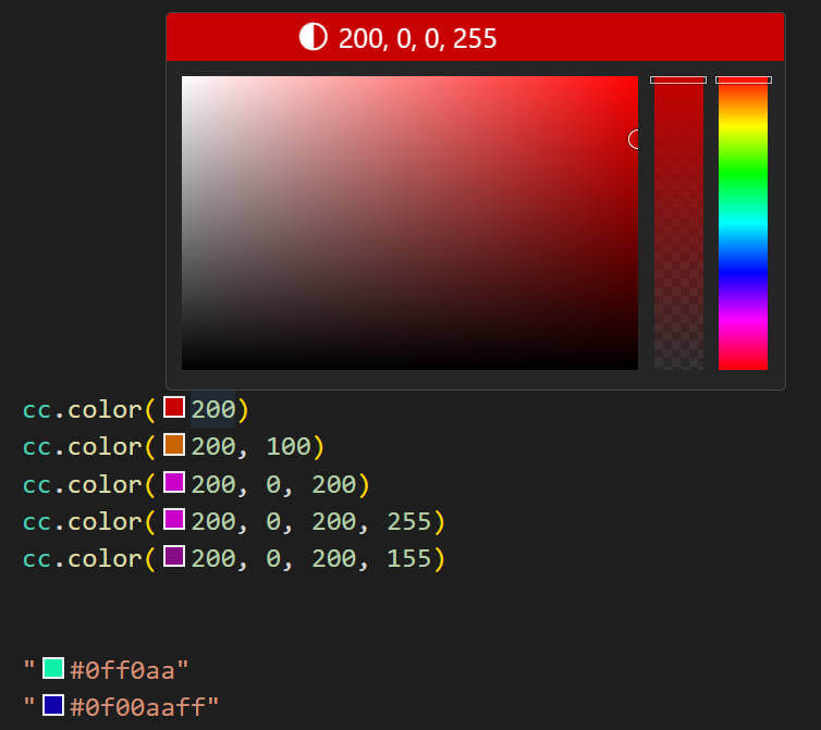 - 可在设置 - CocosToolbox.colorLanguages中配置支持颜色预览的文件类型,默认支持类型为javascript、typescript、json