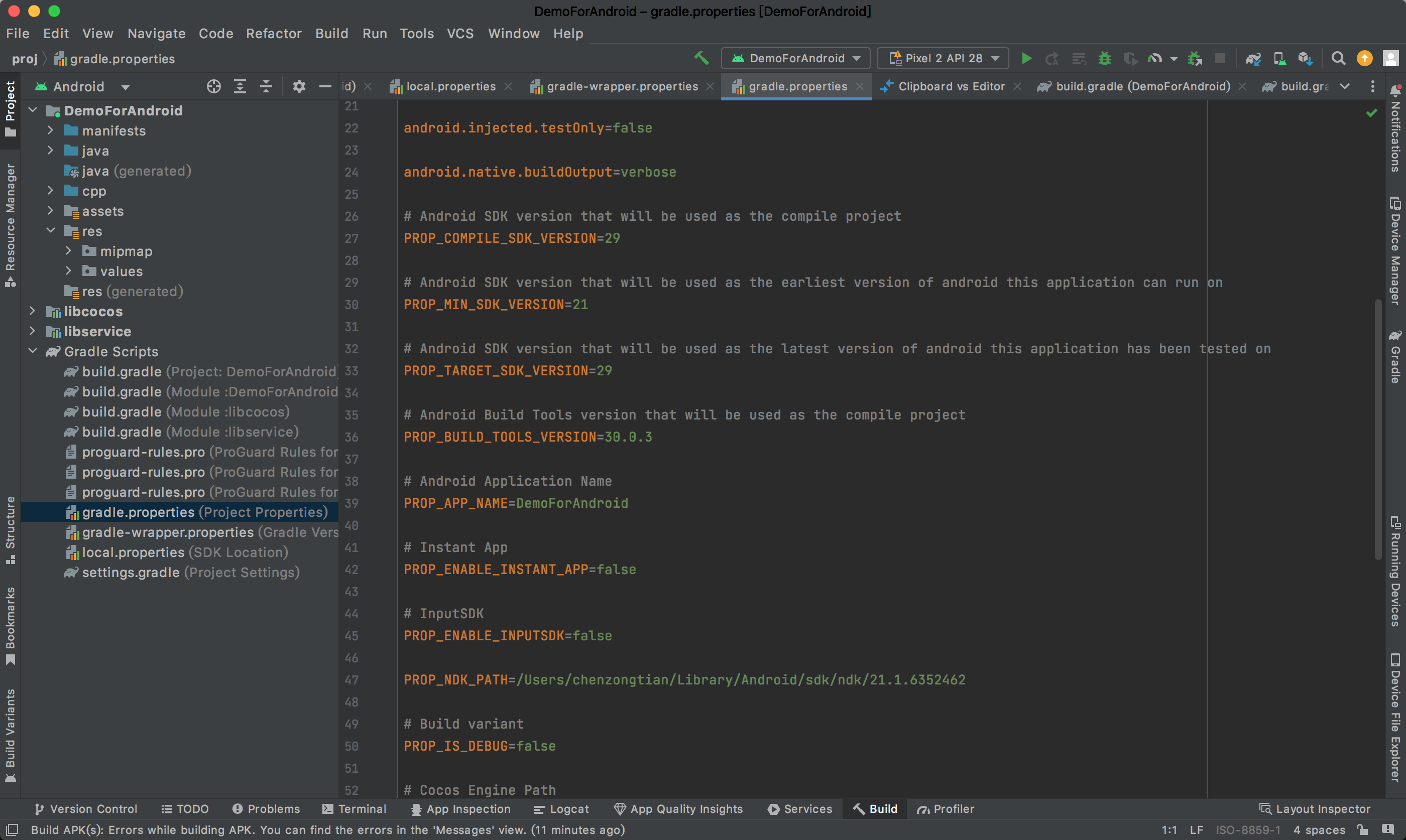 Execution failed for task ‘:DemoForAndroid:buildCMakeRelWithDebInfo[armeabi-v7a][cocos]’.
