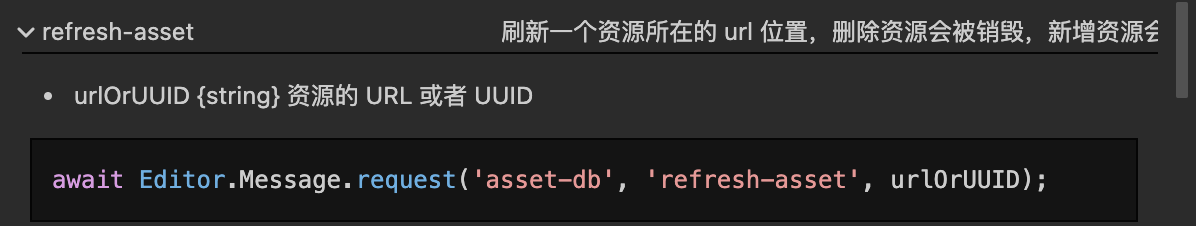 await Editor.Message.request(‘asset-db’, ‘refresh-asset’, urlOrUUID);