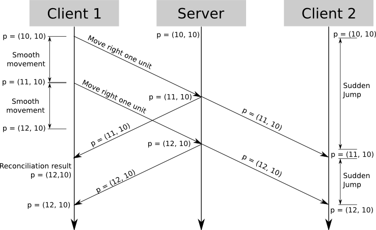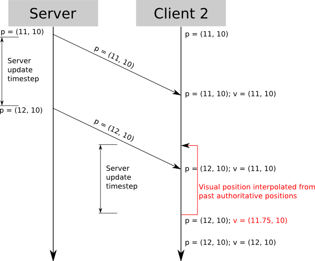 请注意,使用此技术时,每个玩家看到的游戏世界呈现略有不同,因为每个玩家看到 的是现在 的自己,但看到 的是过去的 其他实体。但是,即使对于快节奏的游戏,看到 100 毫秒的其他实体通常也不会明显。