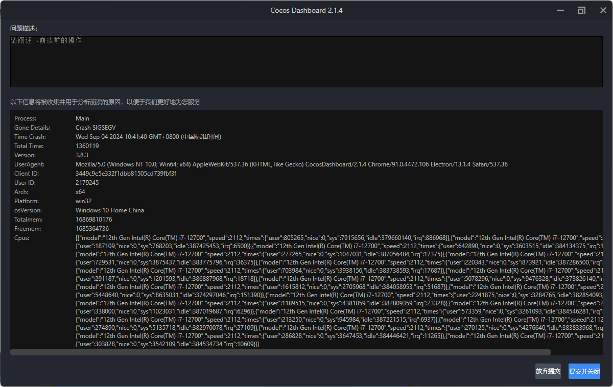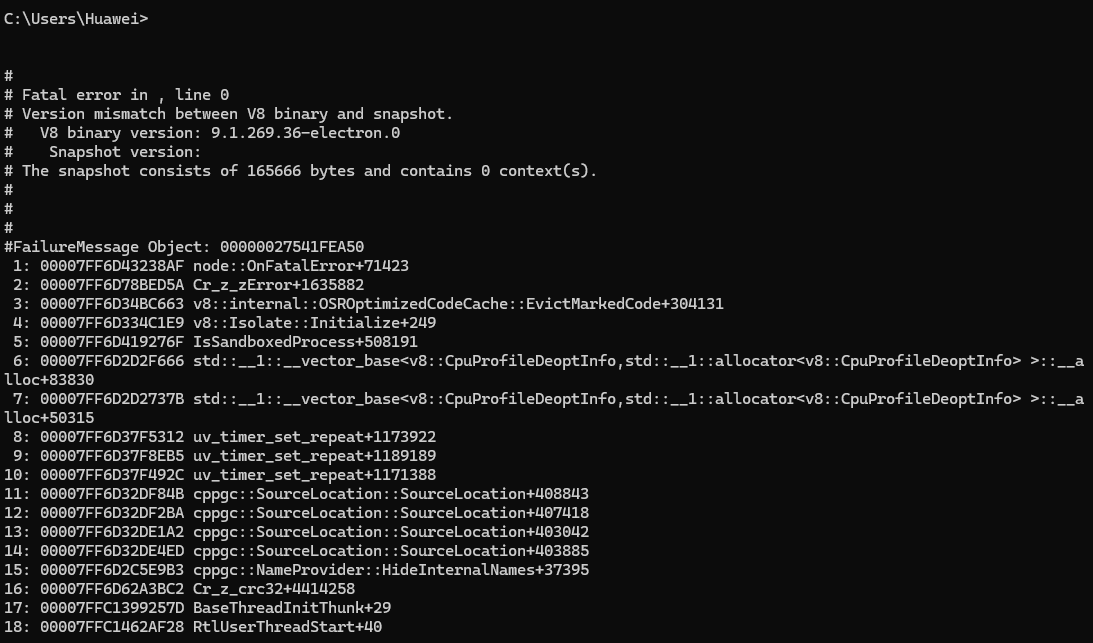 这个感觉是 v8 的 zlib 解压 snapshot 的时候报错了。 确认一下安装目录下是否存在 v8_context_snapshot.bin 和 snapshot_blob.bin ? 如果存在,计算一下他的 md5,看看值是多少?