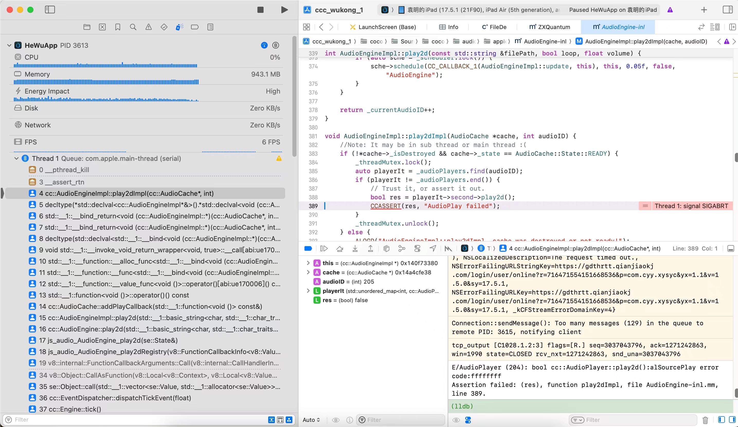 同样的报错位置,ios播放同时播放音频数量多就会奔溃,必现的。 只能自己限制数量