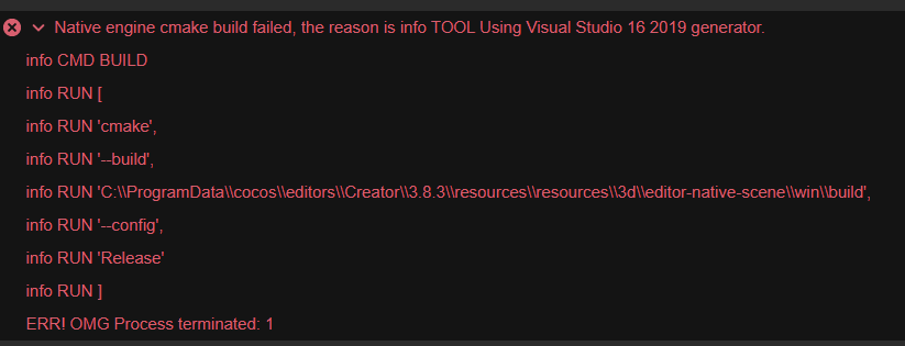 编译引擎报错,Native engine cmake build failed, the reason is info TOOL Using Visual Studio 16 2019 generator.