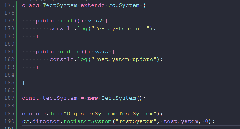 自定义System, init没调用, update正常, 看了引擎代码,Director初始化时,项目代码还没执行,还没有注册进Director,后面通过registerSystem注册进去的, 只有update是正常调用的。