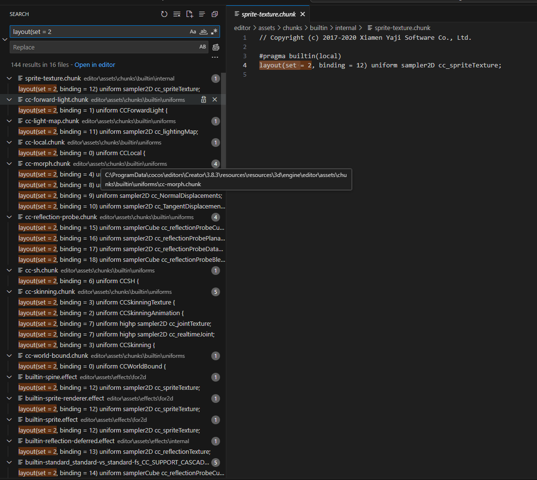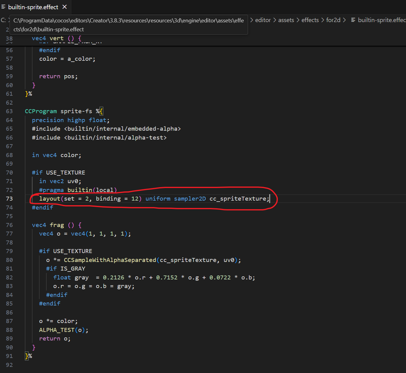 可以找到 binding = 12 就是给 spriteTexture 使用的,其他的可以自己看一下,layout 是 GLSL 设置着色器变量布局的,可以简单理解设置 绑定位的,方便通过绑定获取该变量。