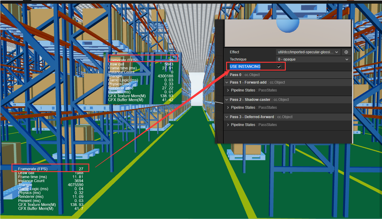 USE INSTANCING 开启之后draw 减少了,但是fps 也减少了,