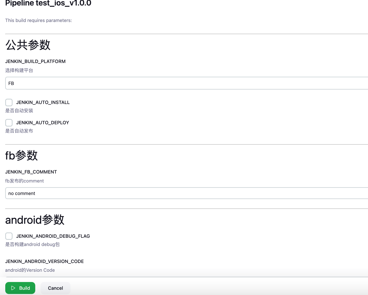 parameters { //公共参数 choice(name:'JENKIN_BUILD_PLATFORM', choices: ['FB', 'WEB-MOBILE', 'ANDROID', 'IOS'], description: '选择构建平台') booleanParam(name:'JENKIN_AUTO_INSTALL', defaultValue: false, description: '是否自动安装') booleanParam(name:'JENKIN_AUTO_DEPLOY', defaultValue: false, description: '是否自动发布') //FB参数 string(name:'JENKIN_FB_COMMENT', defaultValue: 'no comment', description: 'fb发布的comment') //Android参数 booleanParam(name:'JENKIN_ANDROID_DEBUG_FLAG', defaultValue: false, description: '是否构建android debug包') string(name:'JENKIN_ANDROID_VERSION_CODE', defaultValue: '3', description: 'android的Version Code') string(name:'JENKIN_ANDROID_VERSION_NAME', defaultValue: '1.0.7.2', description: 'android的Version Name') choice(name:'JENKIN_ANDROID_ARTIFACT_TYPE',choices: ['APK', 'AAB'], description: '构建android产物类型') //IOS参数 booleanParam(name:'JENKIN_IOS_INTERNAL_TESTING_ONLY_FLAG', defaultValue: false, description: '是否testflight internal testing only') string(name:'JENKIN_IOS_BUNDLE_VERSION_SHORT', defaultValue: '1.0.0', description: 'IOS的Version Short') string(name:'JENKIN_IOS_BUNDLE_VERSION', defaultValue: '1.0.0.0', description: 'IOS的Version') } -