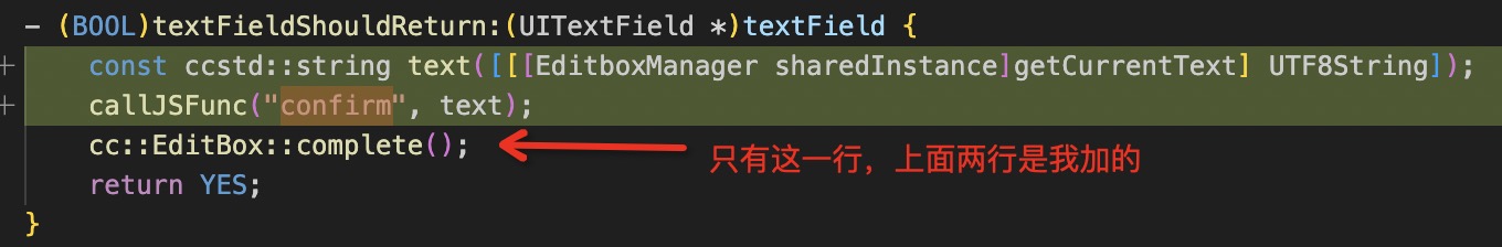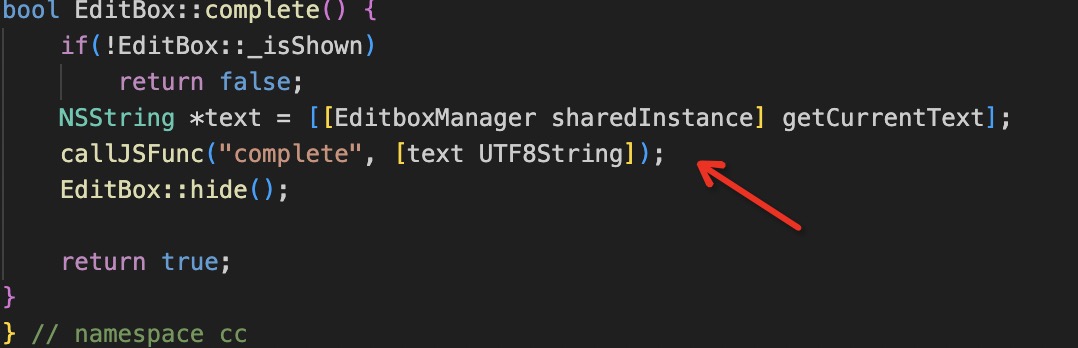 一去源代码EditBox-ios.mm一看,监听虚拟键盘Return的地方,只调用了一个cc::EditBox::complete函数