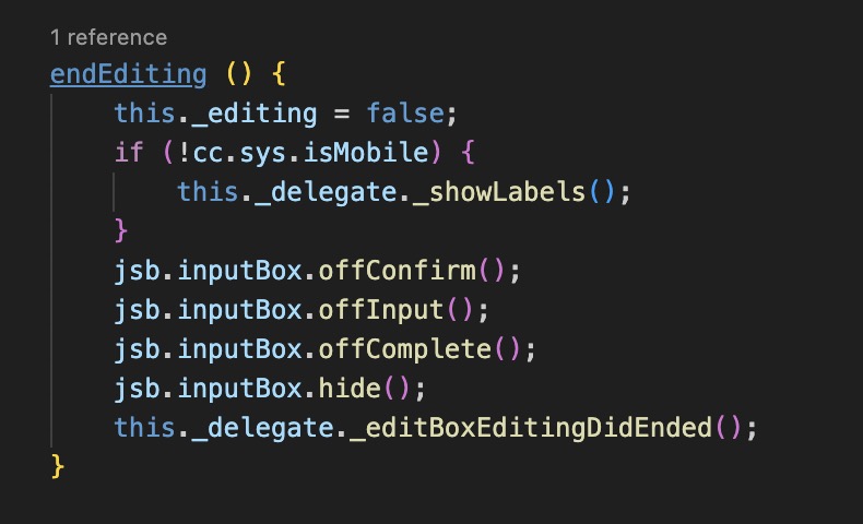 cc::EditBox::complete函数通过JSB调用了一个"complete"函数,这个函数 并不会触发Return事件