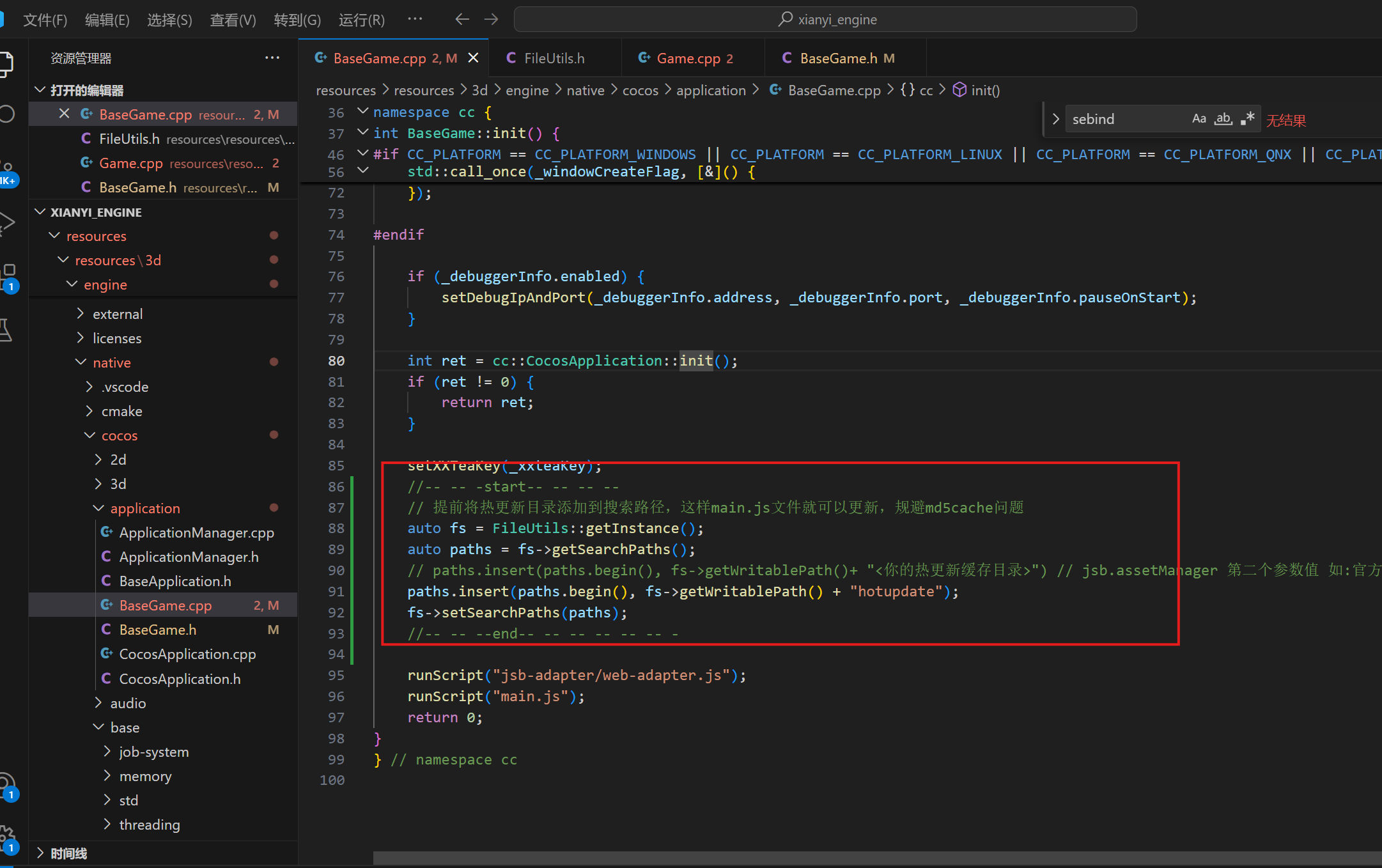 感谢回答,目前还找到的方法是将main.js也加入热更新列表中,不过需要在main.js注入前设置好检索路径,这边发现在native\engine\common\Classes\Game.cpp的init中调用cc::FileUtils的方法会产生致命错误直接闪退,不知道什么原因