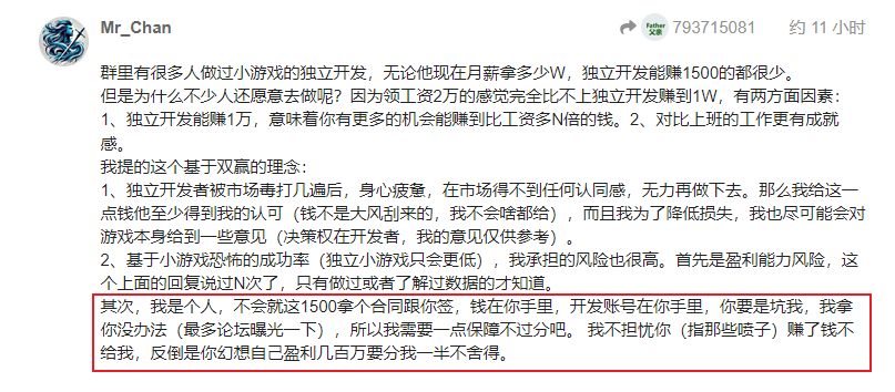实在看不下去了,你有毛风险啊,你就出了1500,还得人家给你做出效果你看了满意才给,还分期。。。 关键是你还拿到了代码。。。。如果一款精品游戏人家不给你分红,你光卖代码都盆满钵满,你竟然还认为自己有风险,。,