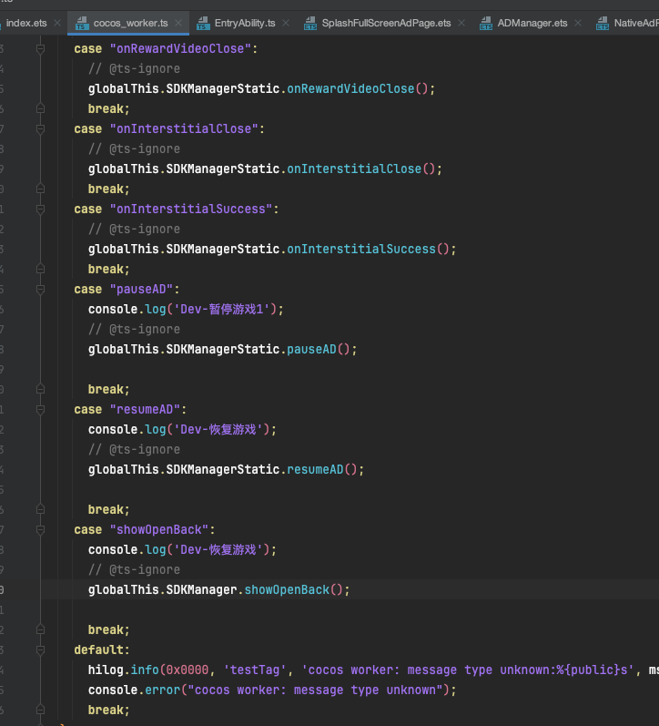 就是还是通过worker来实现,当你用在cocos的ts脚本中使用globalThis.oh.postSyncMessage(messageType,messageData)时,他会去在鸿蒙工程里的cocos_worker.ts里使用nativeContext.postSyncMessage,