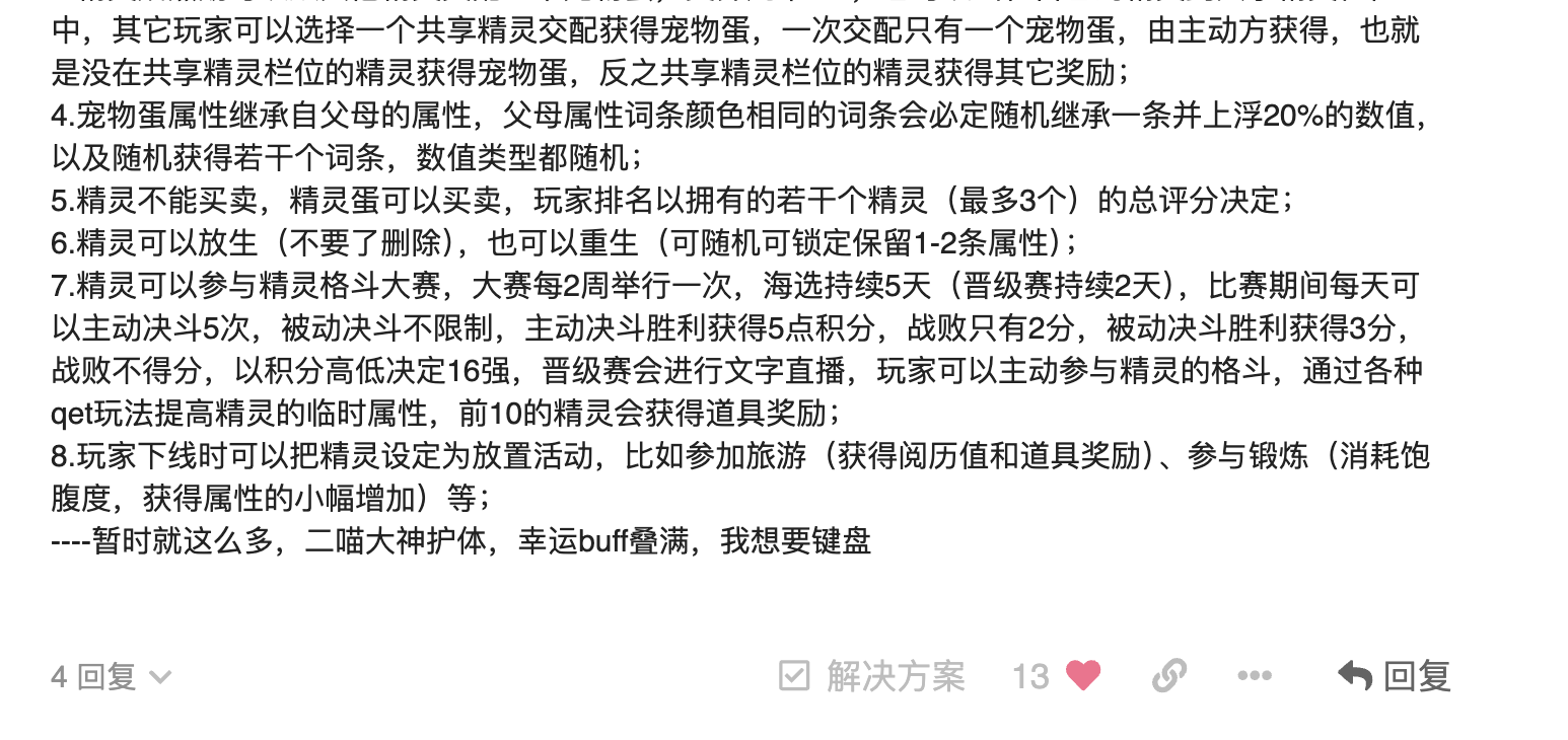7.精灵可以参与精灵格斗大赛,大赛每2周举行一次,海选持续5天(晋级赛持续2天),比赛期间每天可以主动决斗5次,被动决斗不限制,主动决斗胜利获得5点积分,战败只有2分,被动决斗胜利获得3分,战败不得分,以积分高低决定16强,晋级赛会进行文字直播,玩家可以主动参与精灵的格斗,通过各种qet玩法提高精灵的临时属性,前10的精灵会获得道具奖励;