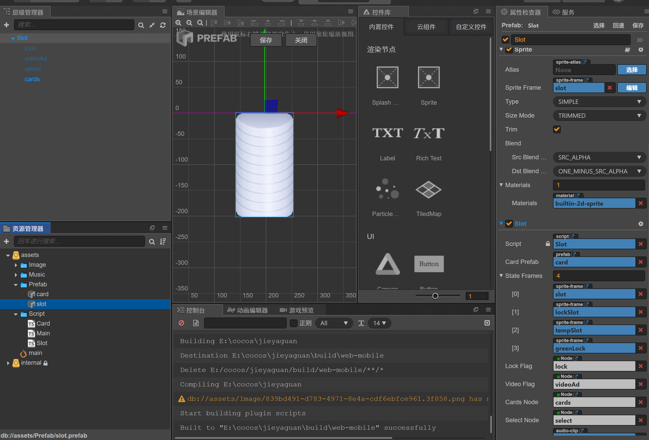 一共12个槽位,三行四列,当然这个你可以自己决定多少。这种规则布局本能反应就是要用Cocos Creator的Layout组件的Grid布局来实现。那么槽位当然是要抽象为预制体Prefab,方便复用逻辑。每个槽位都有自己的坐标,那么发牌就是给槽位添加卡牌,发到对应的槽位就行,那重点是槽位预制体的实现。如下图:卡槽有四个子节点,lock锁的标志,videoAd视频广告标志,video是否可以合并标志,cards存放卡牌容器。slot本身负责根据状态切换纹理:stateFrame。