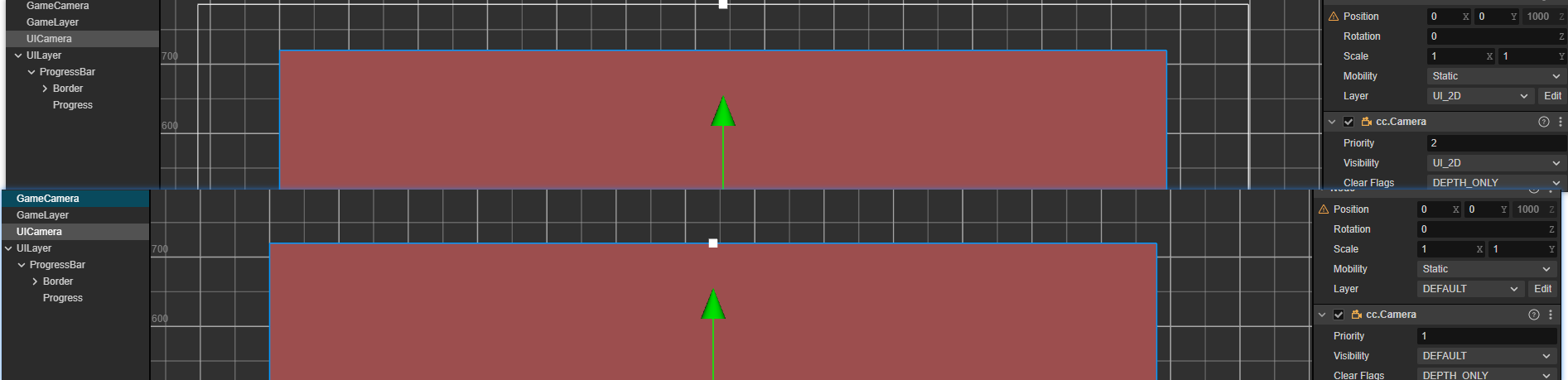 抱歉,我是一个cocos菜鸟,我想做一个UI层,固定在最上层,我现在创建了两个相机,一个UICamera,一个GameCamera,我设置了两个相机的 visibility 属性,分别为 default 和 UI_2D,另外新增了两个节点,UILayer和GameLayer,设置了相应的Layer,但是当GameCamera跟随人物一起移动时,UI层也移动了,双相机在three.js中很好实现,而在cocos中,它变的无比艰难,我尝试搜索一些资料,但是我没有找到