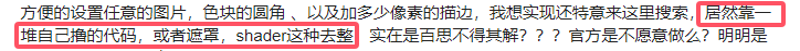 我说的简单的功能就是为什么CCC,不能在精灵图或者纯色图 的内置属性 上方便的去设置圆角/描边 ?这种在PS第一版就实现的东西应该不是什么很难的技术啊,为什么不做进内置的默认组件功能里面,能方便的设置任意的图片,色块的圆角 、以及加多少像素的描边,我想实现还特意来这里搜索,居然靠一堆自己撸的代码,或者遮罩,shader这种去整,实在是百思不得其解???官方是不愿意做么?明明是很常用的,也是很实用的东西