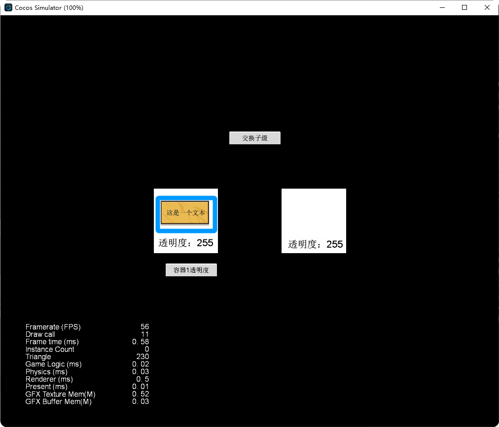 创建两个容器,容器1的UIOpacity组件改变透明度后会发现里面的子节点透明度发生了变化,然后点击交换子级按钮把容器1里面的子节点添加到容器2里面,发现子节点的透明度没有被还原,还是呈现出半透明的状态demo.zip (8.0 KB)