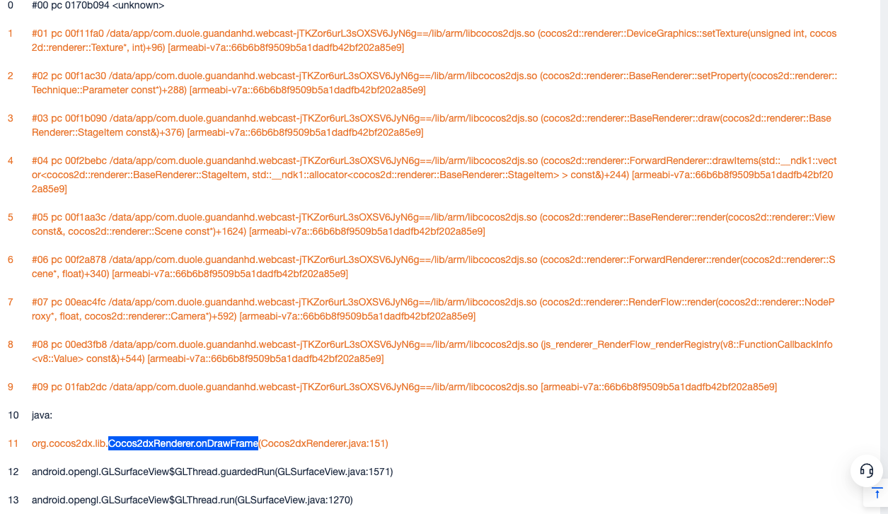 最近碰到很多次调用到Cocos2dxRenderer.onDrawFrame方法崩溃,大多数出现在模拟器上面。