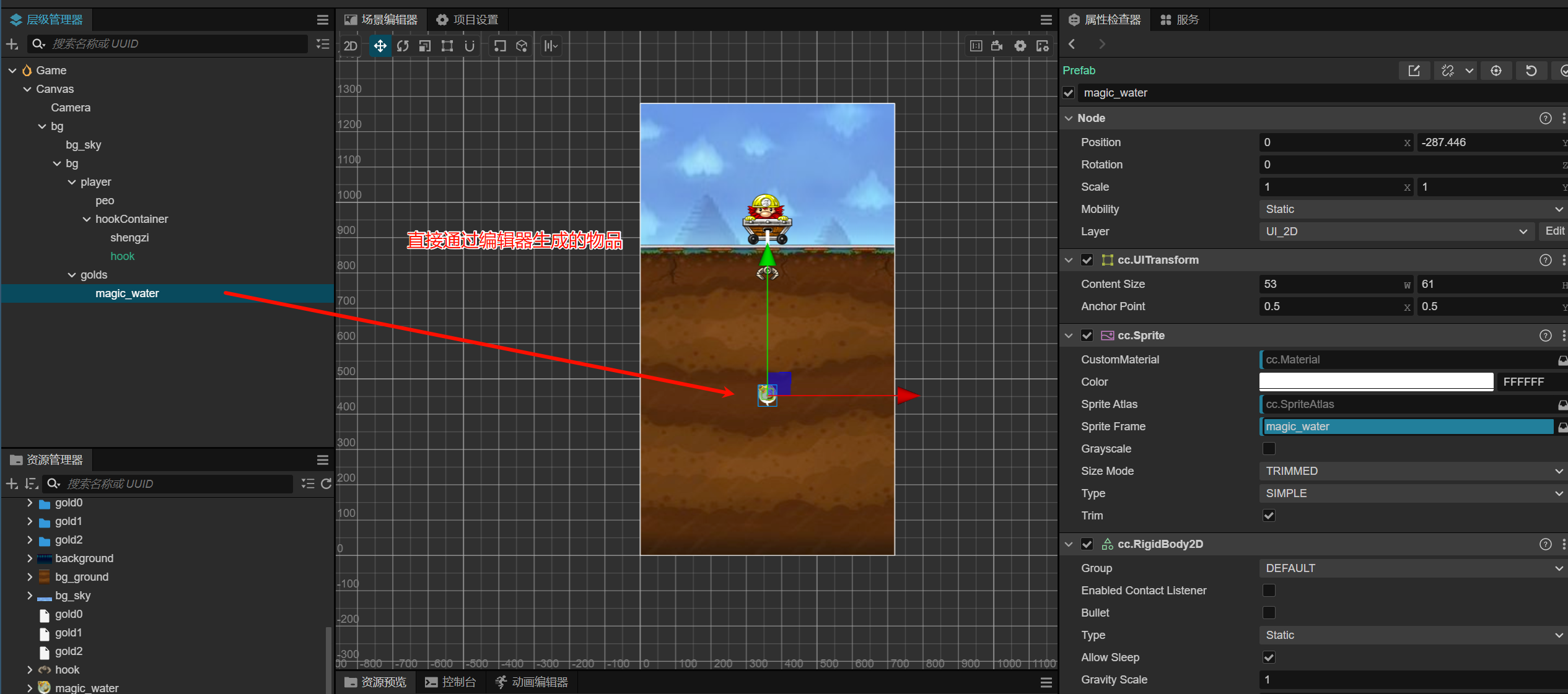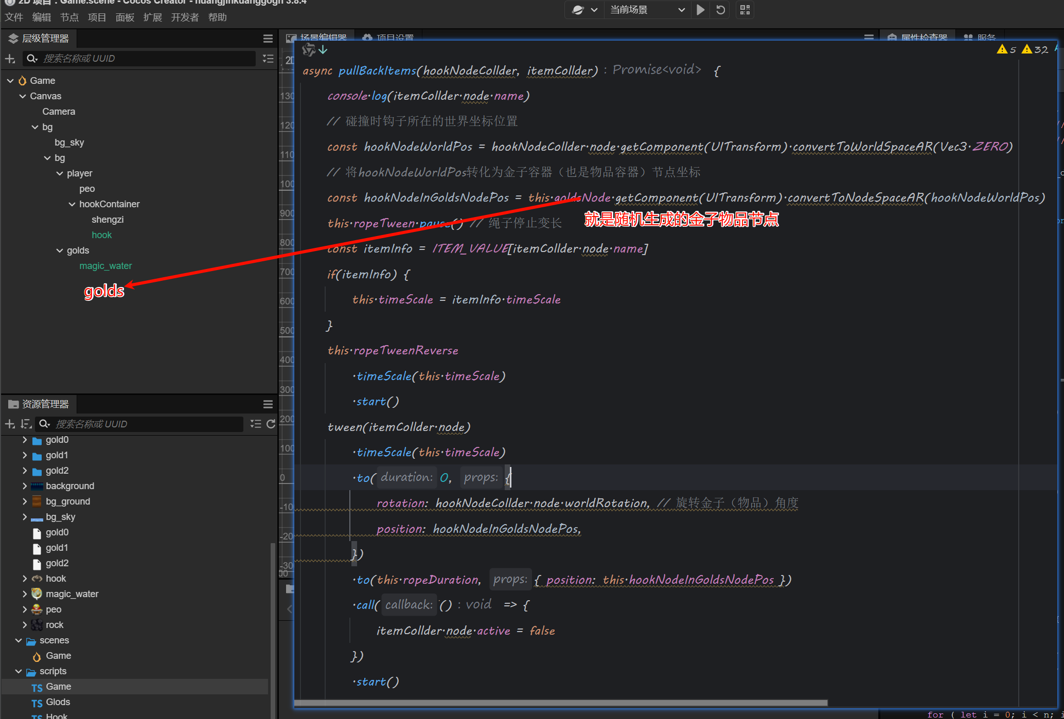 各位大神,在制作一个黄金矿工小游戏时遇到以下问题:钩子捕抓到由代码随机生成的节点时,节点重新设置的位置存在偏差,主要想知道这个偏差为什么会产生,这个偏差我是有其他方式解决的,就是想知道为什么编辑器自己摆的物品(金子,石头,药水)不会出现偏差,通过脚本自动生成的物品却会出现偏差