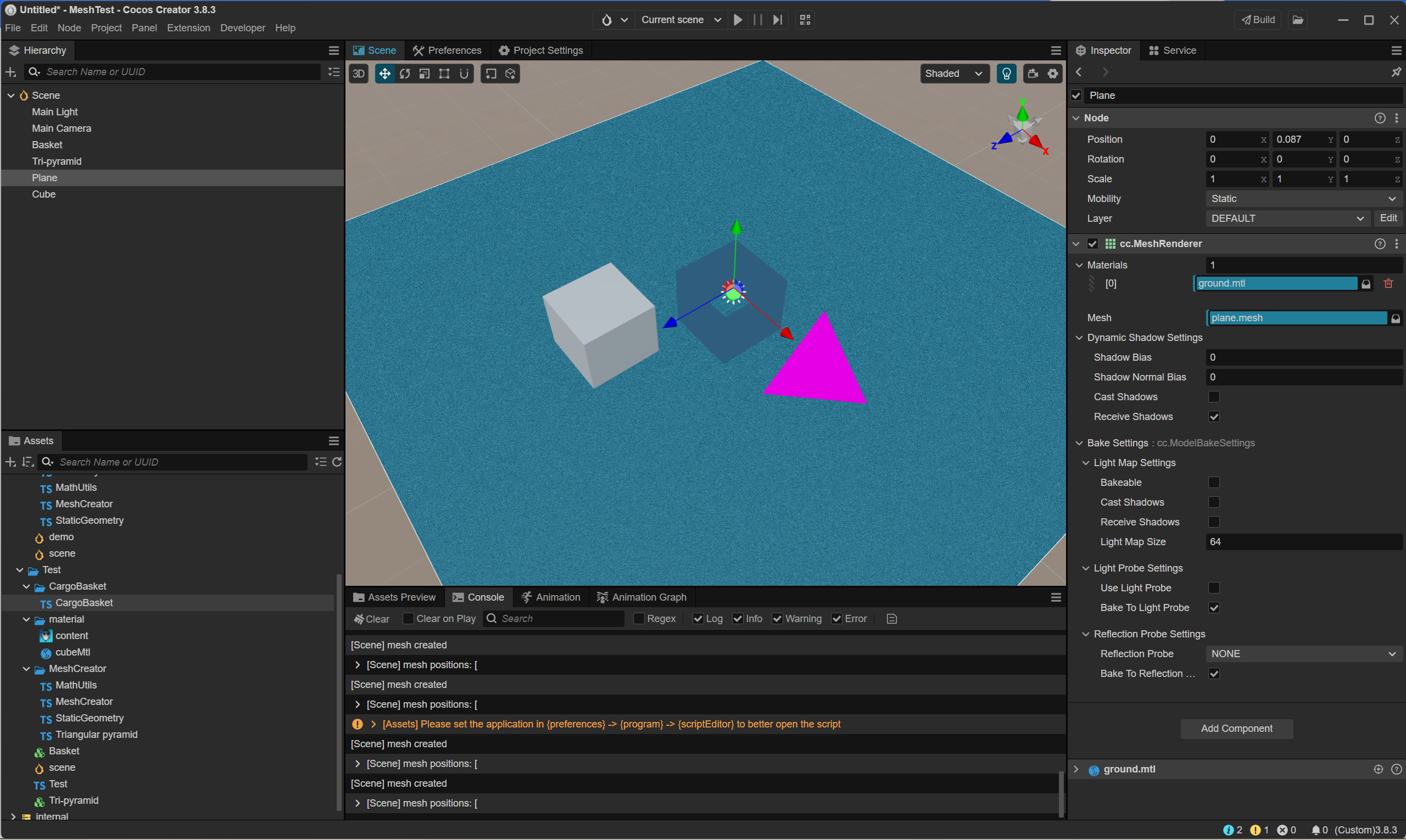 想通过自定义网格建立模型,写了一个ts脚本··CargoBasket.ts··,在脚本中使用utils.createMesh方法创建了网格,并将网格挂载到模型上,但运行后模型材质丢失,显示为粉红色。如下图: