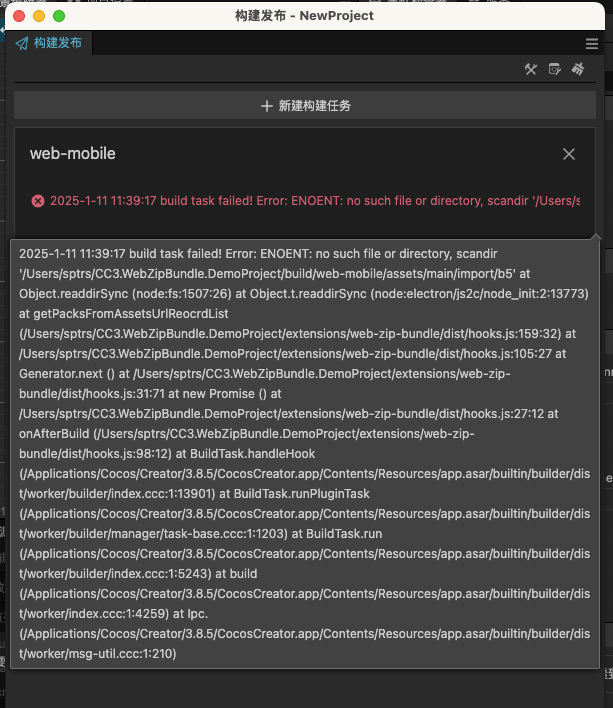 很奇怪, 我跑的是你的 CC3.WebZipBundle.DemoProject。 报错的地方:[Assets] ENOENT: no such file or directory, scandir ‘/Users/sptrs/CC3.WebZipBundle.DemoProject/build/web-mobile/assets/main/import/b5’ 我看了一下这个路径下确实没有b5这个路径, 在library下是有的, 打包的时候没有打到build下。 应该不是插件的问题, 不确定是什么原因。 我的电脑是 mac m2, 我再找找原因, 感谢回复