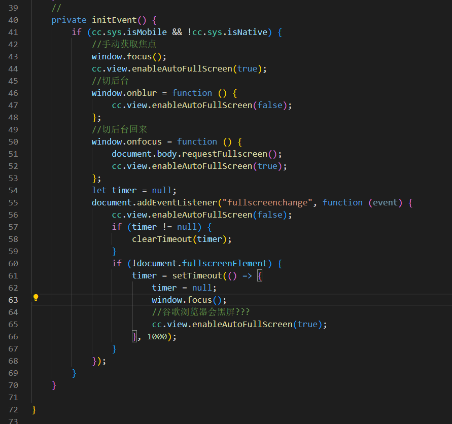 在Chrome上切后台回来后获得焦点进入全屏模式会黑屏,高版本或者其他浏览器上没有这种问题。 使用了cc.view.enableAutoFullScreen(true)就会导致黑屏。 浏览器版本107.0.5304.105