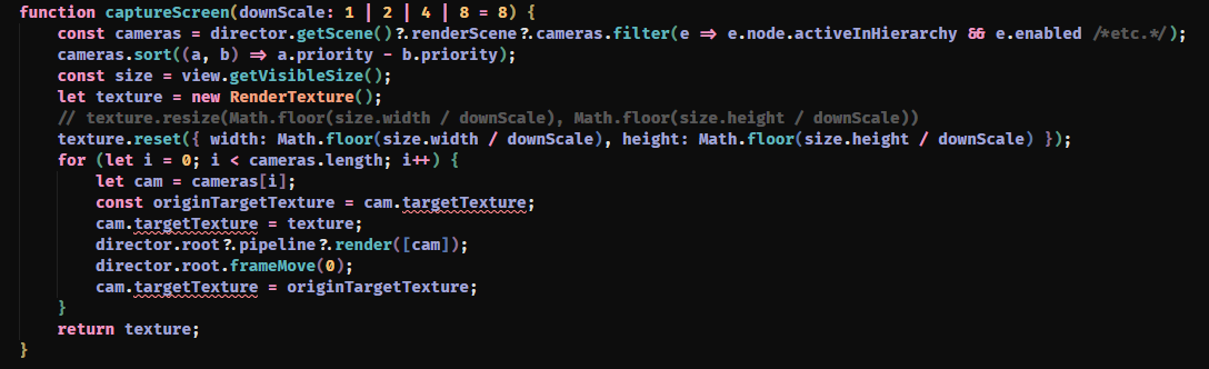 我这边按代码直接获取的camera不知为何不能直接用来截屏(代码提示类型不一样),后面我改成用组件属性获取两个相机的引用来截屏就可以了