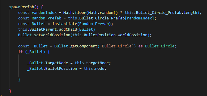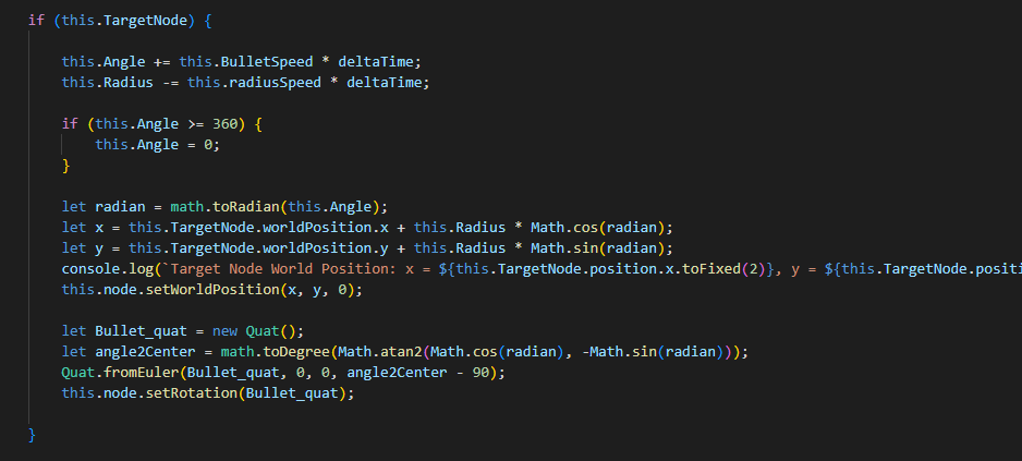 如图所示,我的预期是子弹从白色方块处射出,既图中红色标记位置,然后绕圆点进行内旋的运动。但是运行后,子弹是从蓝色标记处射出,不知道具体问题出在了哪里,还希望有大佬帮忙指导指导。