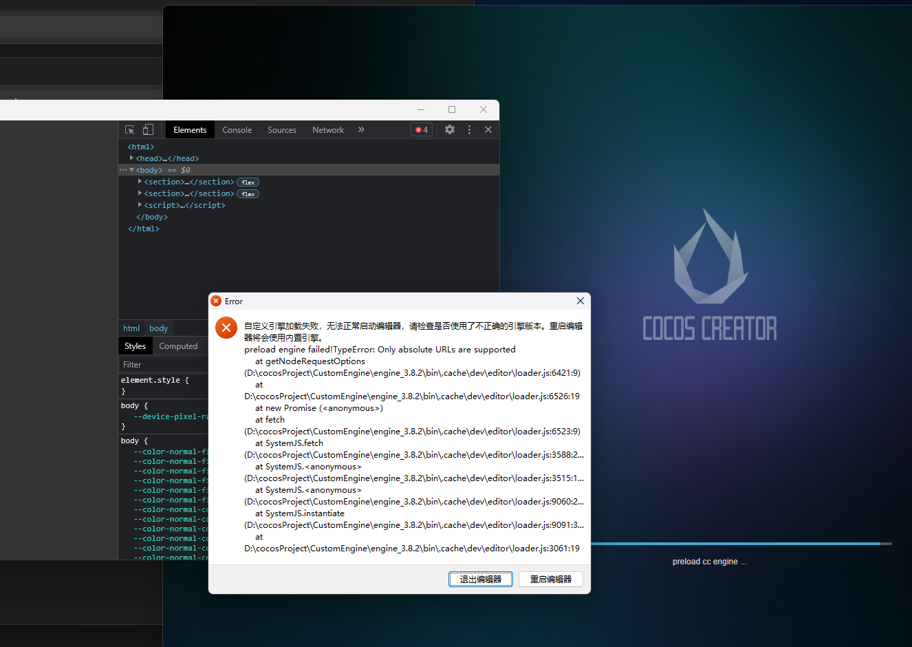 全部流程标准的按照文档来的, 刚开始会卡在fetch , 后面通过科学上网ko,所有都跑完后,在编辑器选择自定义引擎并重启后。 哦豁, 失败。不应该啊。 之前家里的电脑都能成, 这次公司里电脑死活起不了 这还有救么, 0.0