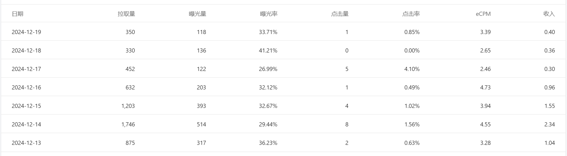 广告也调整了几次。投入与产出比大概是10%吧投100能回来不到10块钱吧。 主要ecpm太低了