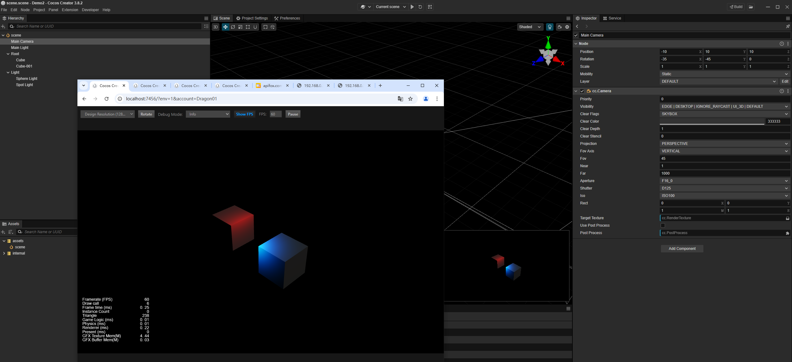 情况很奇怪 在web端和IDE里都是正常的 正方体分别显示红色和蓝色 但是在android端和pc模拟器上都只剩下了平行光的白色
