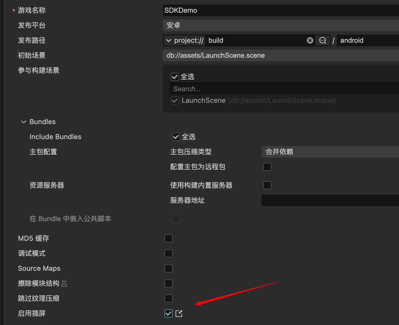 在安卓的配置中,启用插屏是可以自己勾选要不要的