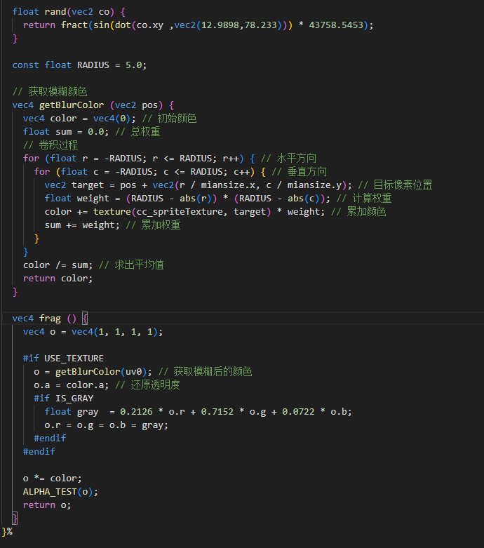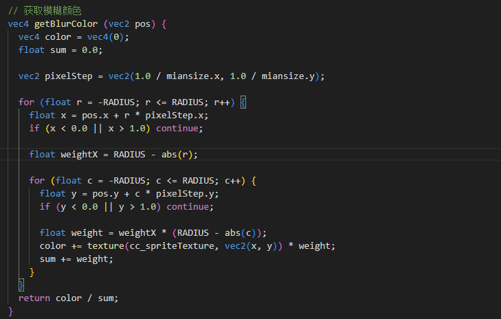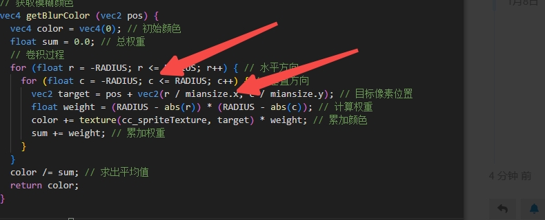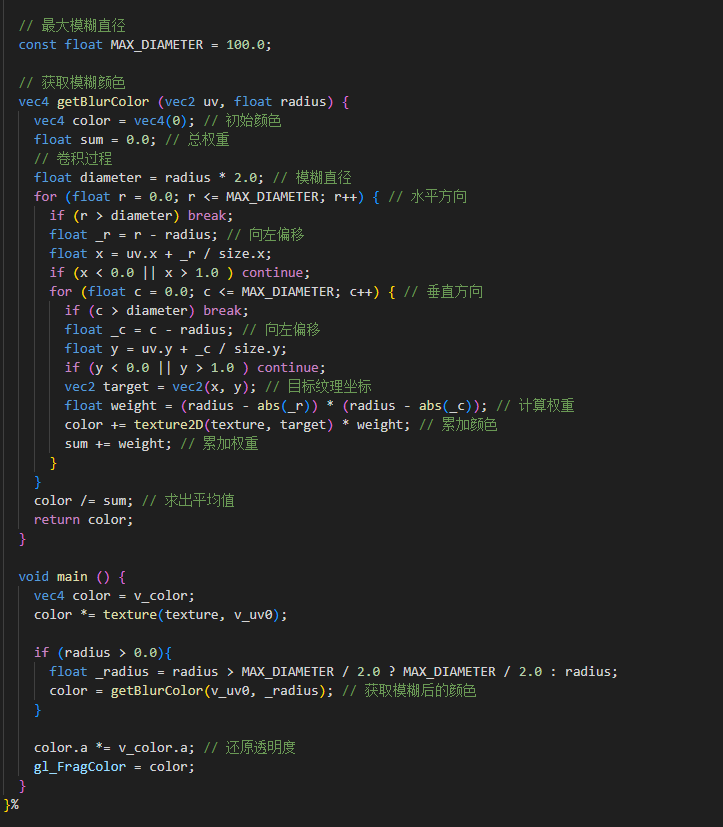 讲道理2.x的shader用了可变半径(radius),最大采样直径为100像素。这意味着在最大模糊半径时,需要采样 100x100 = 10000 个像素点,但是我3.x的shader使用了固定半径(RADIUS = 5.0),采样范围是 11x11 = 121 个像素点。采样次数完全不在一个量级为什么性能会低于2.x的时候呢