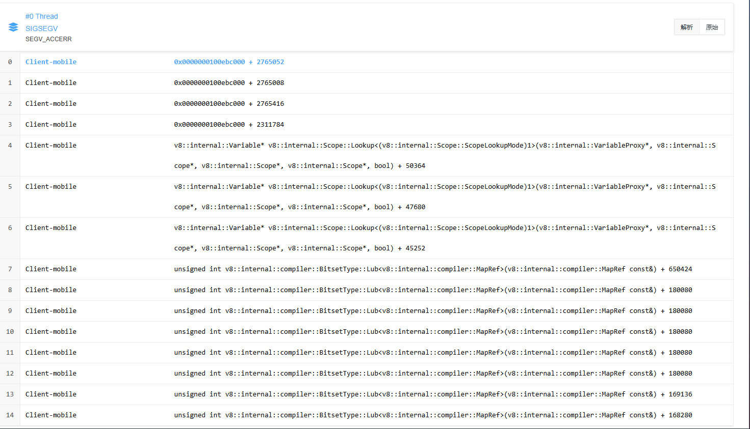 首个报错:v8::internal::Variable* v8::internal::Scope::Lookup<(v8::internal::Scope::ScopeLookupMode)1>(v8::internal::VariableProxy*, v8::internal::Scope*, v8::internal::Scope*, v8::internal::Scope*, bool) + 50364