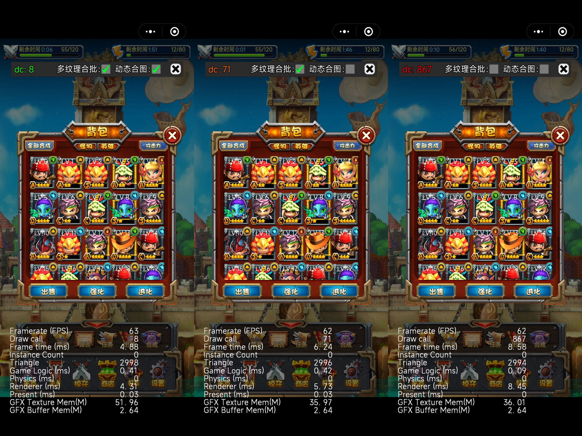 如果在UI上做出基本的dc优化,相同的资源放相邻的排序。这样的话您推荐的多纹理合批不应该会更好吗