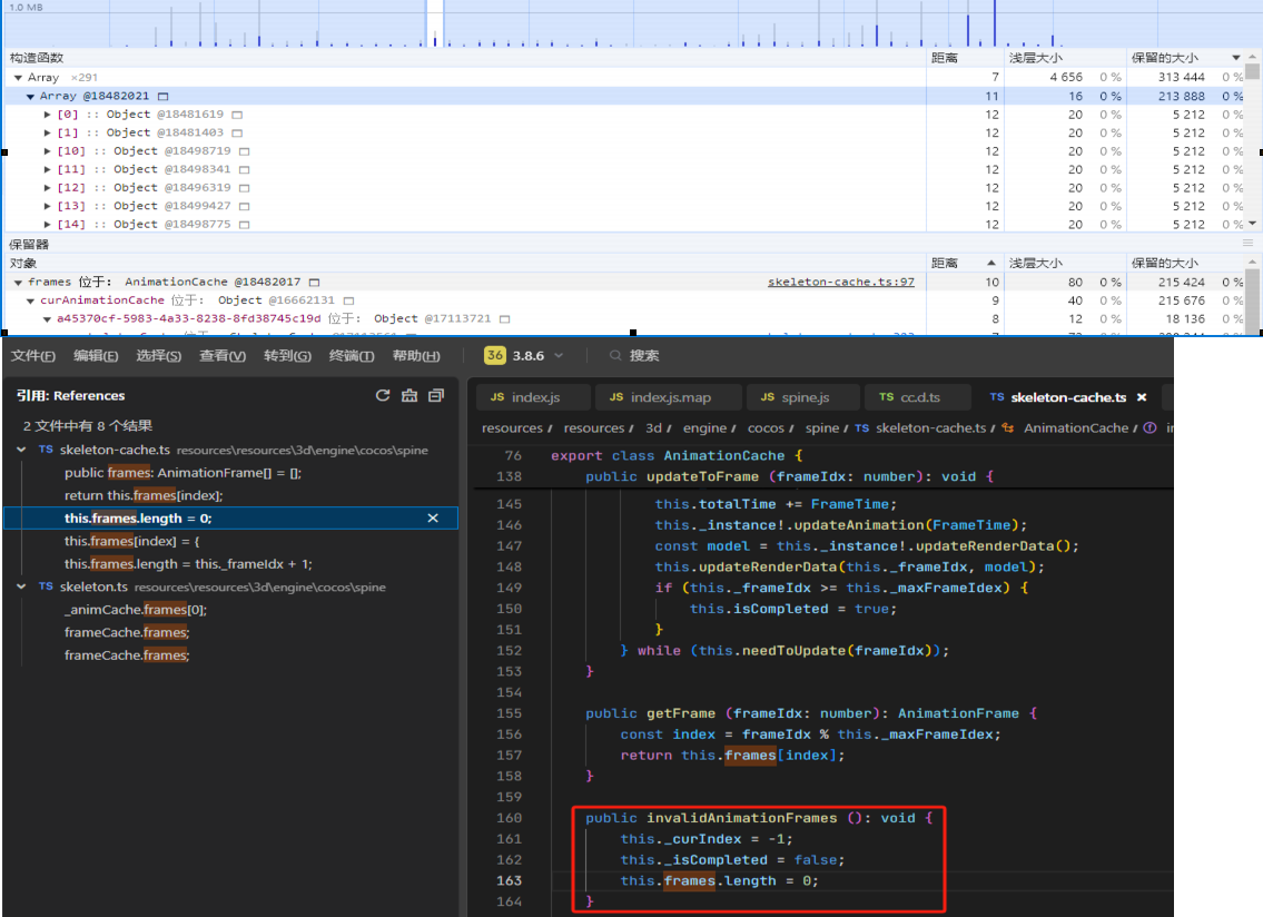 最新3.8.6版本,求助,在排查内存泄漏的时候,发现spine的缓存数据没有清理掉。查看代码唯一能把frames清理的函数invalidAnimationFrames并没有地方调用。可能我的理解有问题,请问这种泄漏应该怎么处理呢?谢谢