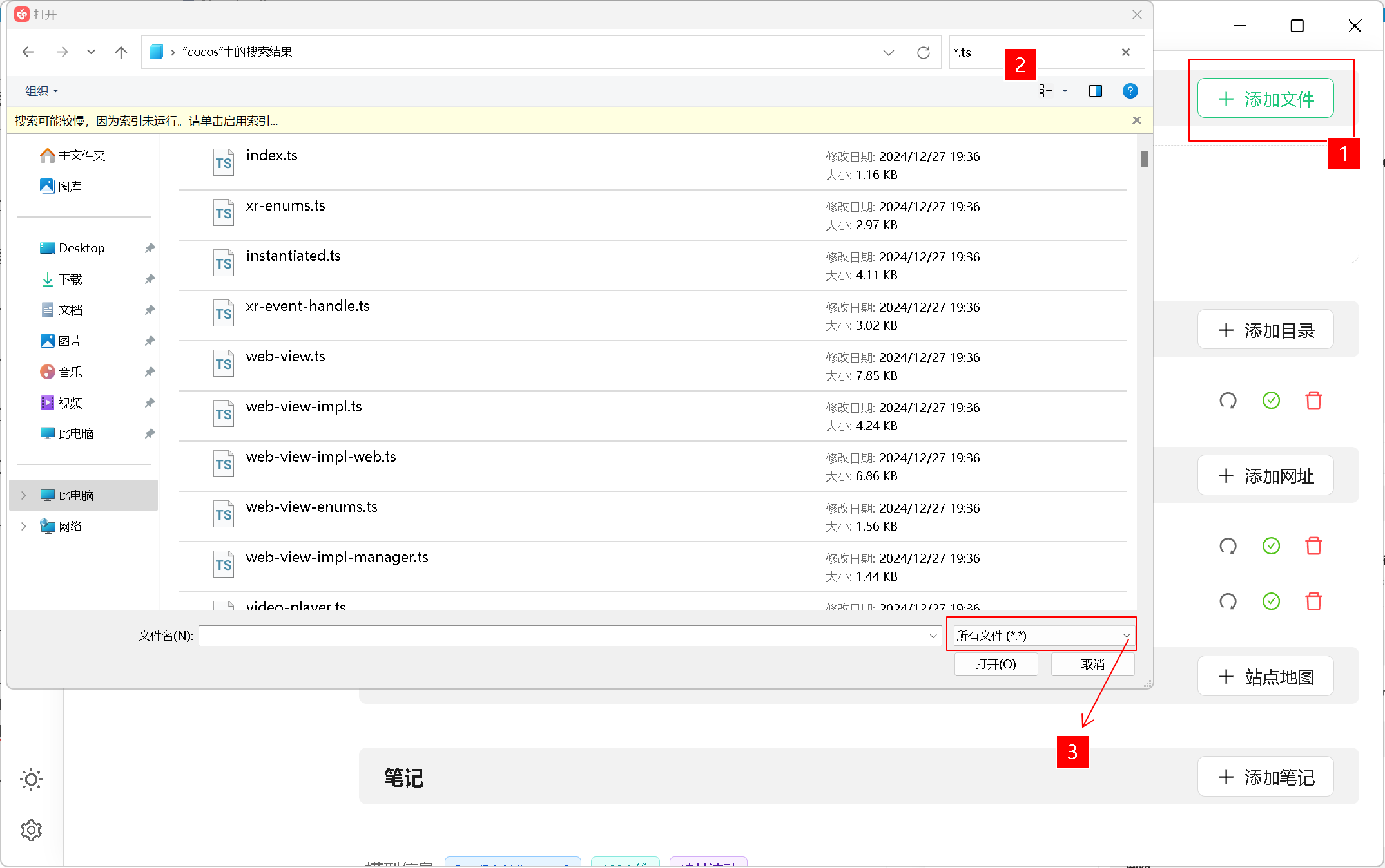 > 一定要如图3点地方选择全部(*) 文件,不然ts文件不会显示、搜索也搜索不到!