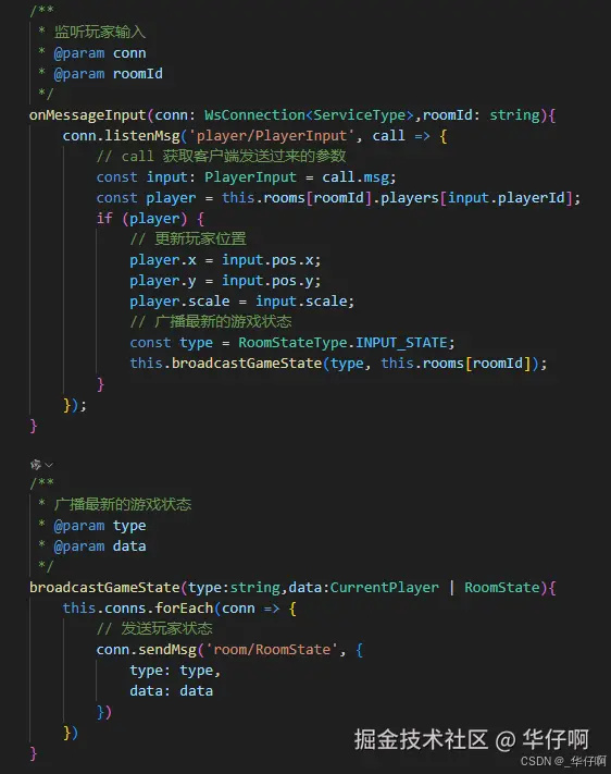 以下onmessageInput()为监听客户端玩家移动的输入,broadcastGameState为广播最新的房间状态,就是将房间内玩家的位置信息广播给该房间的所有人。