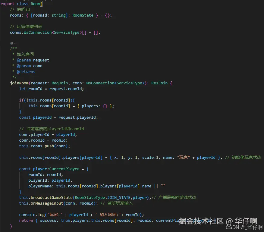 Room类中joinRoom()方法实现了玩家加入房间的功能,包括房间状态的初始化、玩家信息的存储、状态广播以及监听玩家输入等。通过这些步骤,确保了每个玩家能够顺利加入房间并开始游戏。