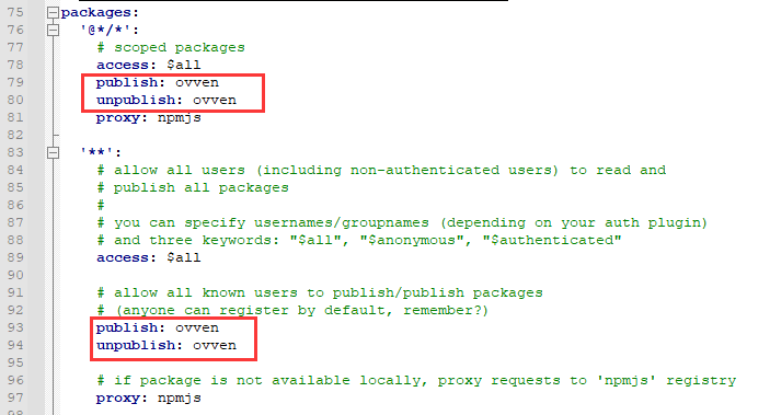 帐号创建完毕后我们打开verdaccio的配置文件,找到packages 字段,